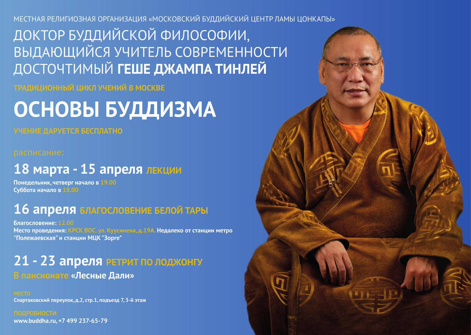 С 18 марта по 16 апреля в Москве прошел весенний цикл лекций по буддизму под руководством Досточтимого Учителя Геше Джампа Тинлея, 16 апреля было даровано Благословение Белой Тары.