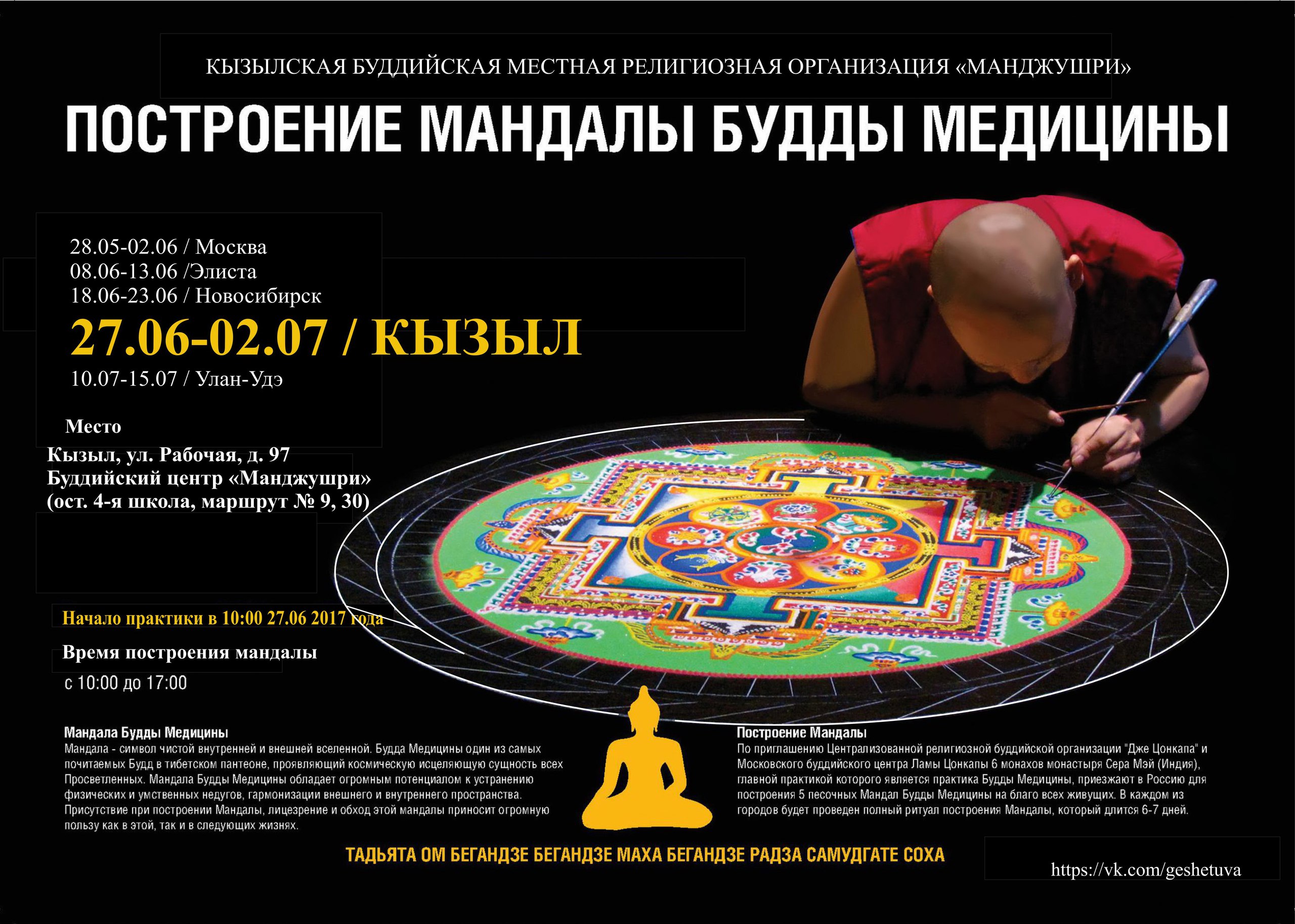 Дорогие друзья, приглашаем всех желающих посетить церемонию построения мандалы Будды Медицины, которая пройдет в республике Тыва в период с 27 июня по 13 июля по адресу г. Кызыл, ул. Рабочая, д.97, буддийский центр "Манджушри" (остановка 4-ая школа, маршрут №9, 30)