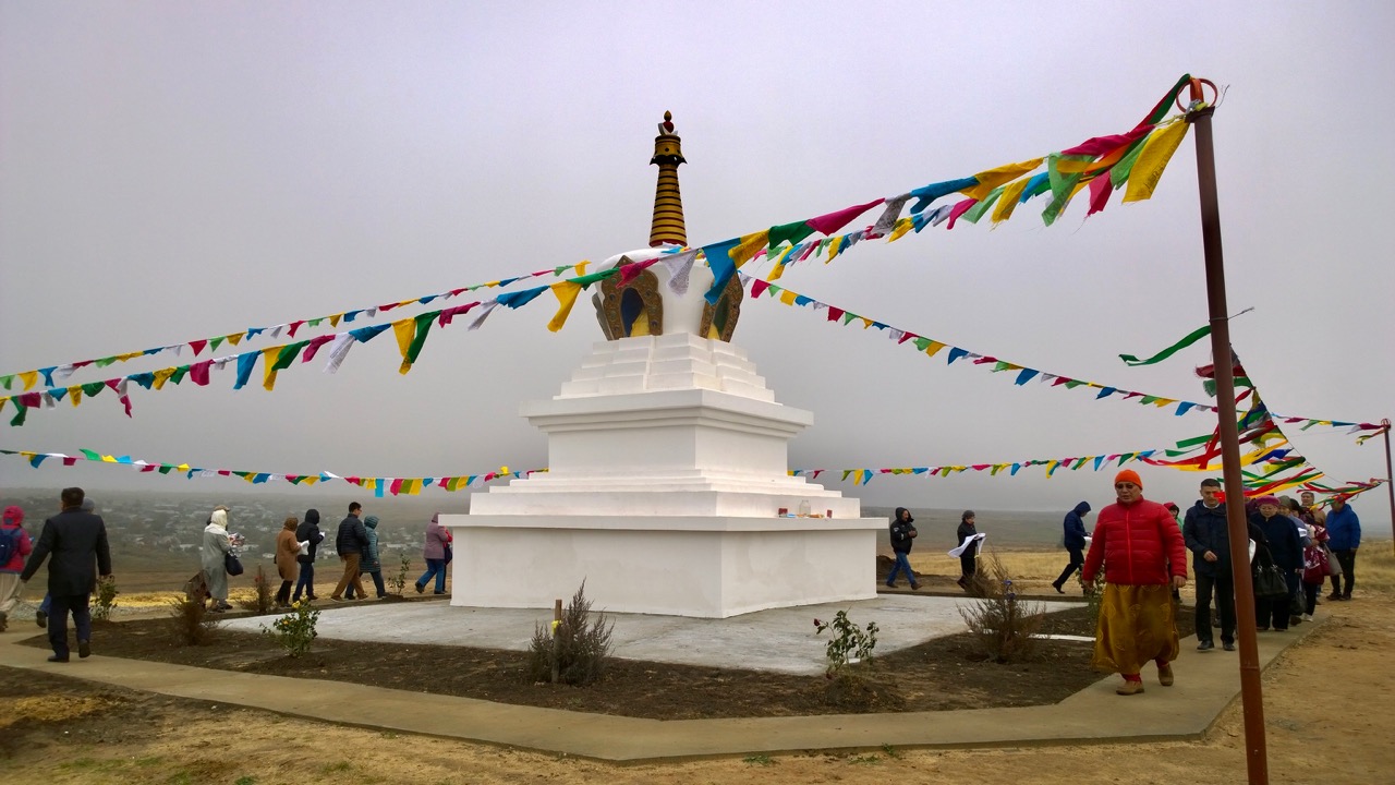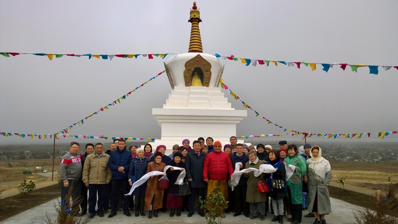 Досточтимый геше Тинлей проводит ритуал освящения ступы Мира в поселке Аршан, г. Элиста