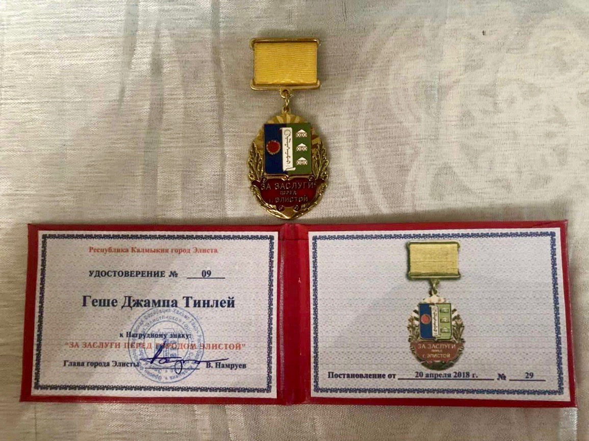 Сегодня, 27го апреля, в рамках празднования 25-летия деятельности Досточтимого геше Джампа Тинлея в России мэр города Элисты, председатель Элистинского городского собрания, Намруев Вячеслав Хозыкович наградил Учителя нагрудным знаком «За заслуги перед городом Элистой».