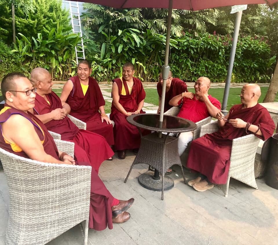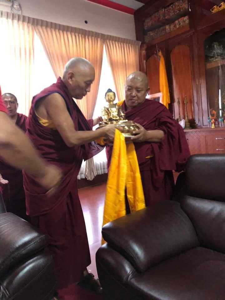 Кхен Ринпоче геше Таши Церинг и геше-лхарамба преподнесли Досточтимому геше Джампа Тинлею статую Будды