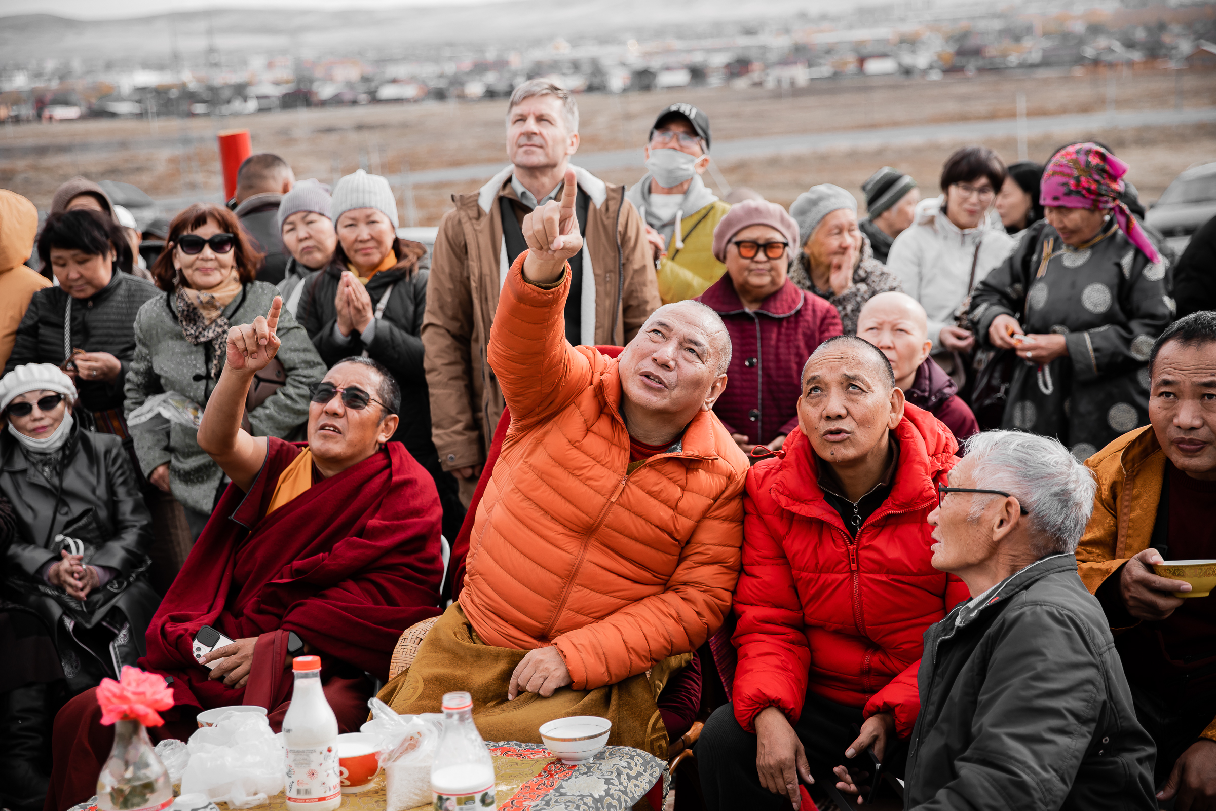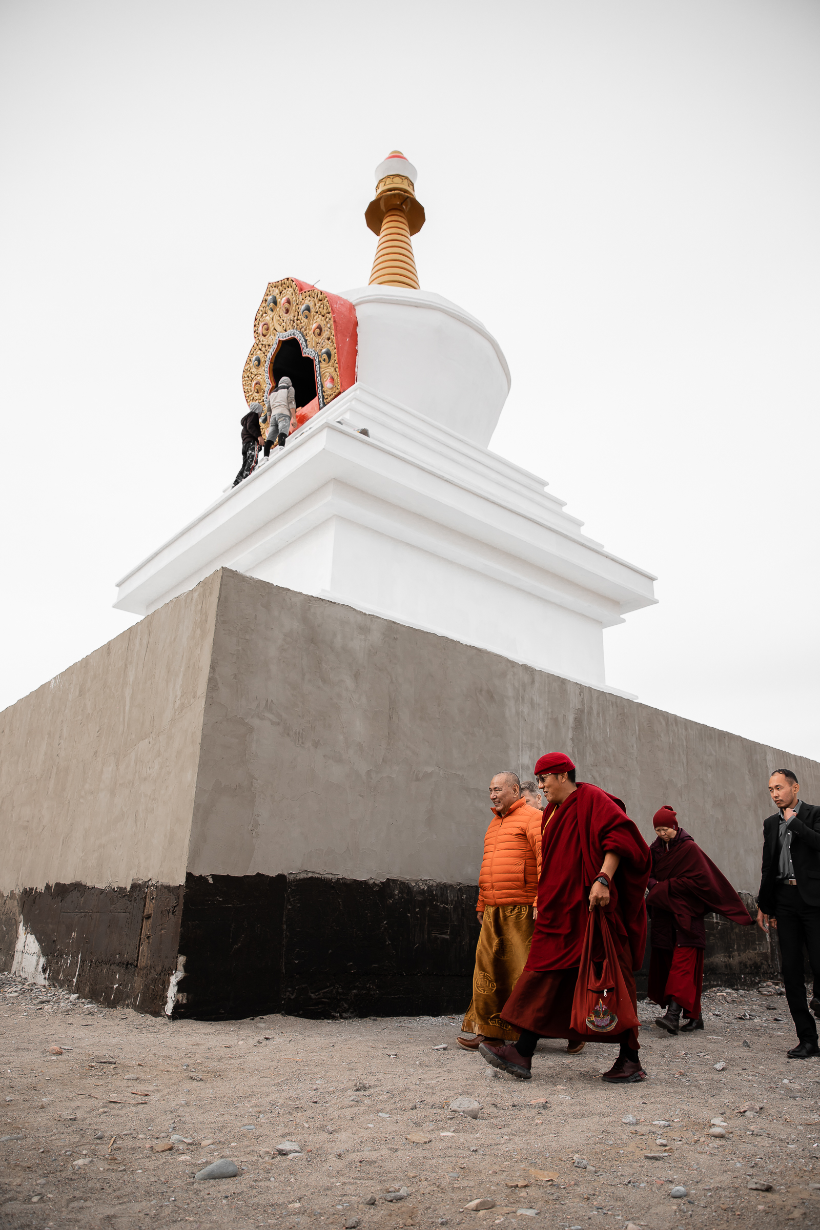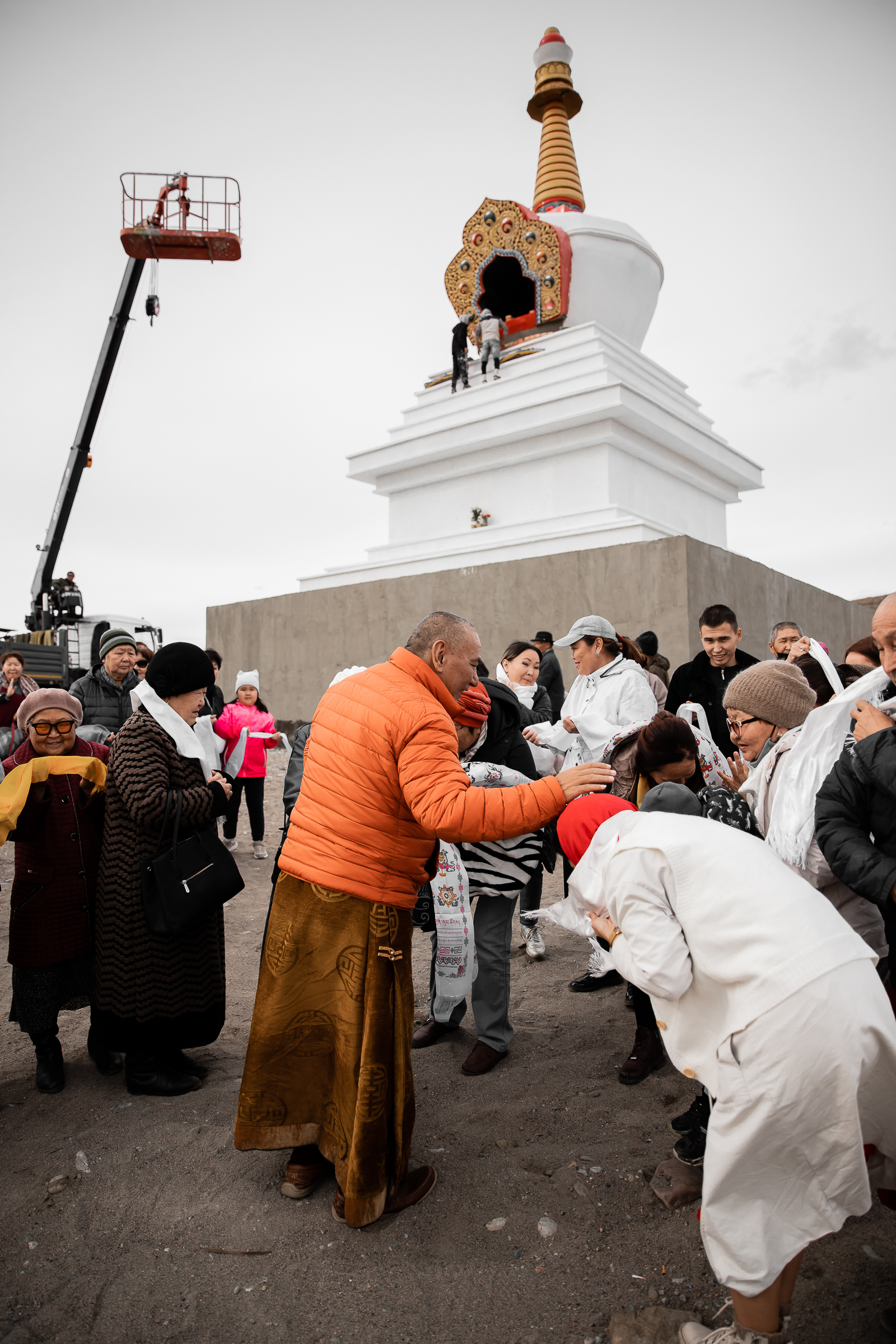 В программе визита Досточтимого Учителя состоялось благословение накануне достроенной 17-метровой буддийской ступы – подарка жителям Тувы от ушедшего из жизни геше Лобсанга Тхубтена. Так Геше-ла с тибетскими монахами и мирянами вознесли молитвы божествам у подножия горы Догээ.