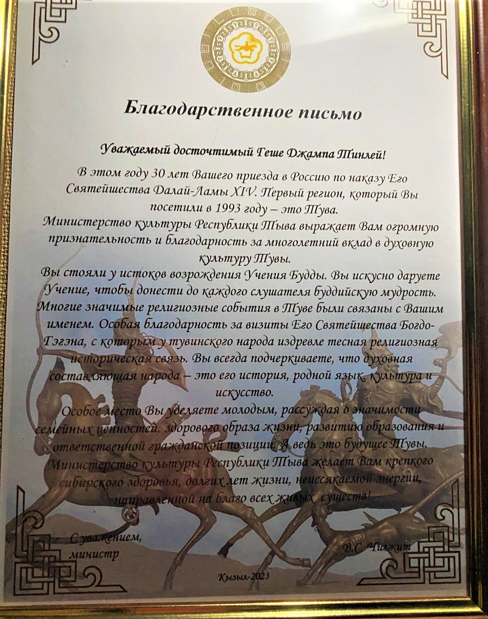 После благословения Белой Тары в Кызыле 29 мая Досточтимый учитель Геше Джампа Тинлей получил благодарственное письмо от министерства культуры Республики Тыва за 30-летнюю деятельность по возрождению буддизма в России. Это свидетельствует о значительной ценности духовных традиций и буддийской культуры в нашей стране. Буддизм является одной из старейших религий, которые продолжают привлекать людей своей мудростью и глубиной. В наших силах поддерживать сохранение традиций и создавать условия, которые позволяют людям изучать Дхарму. Судя по беспрецедентно большому количеству людей пришедших на благословение Белой Тары вера и благодарность Трем Драгоценностями в Тыве велики.
