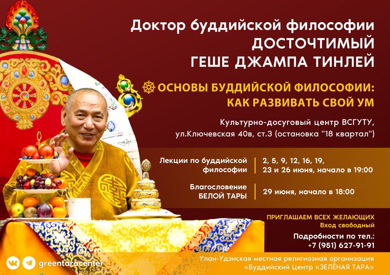 С большой радостью сообщаем, что со 2 июня в Улан-Удэ начнётся традиционный летний цикл Учений Досточтимого Геше Джампа Тинлея. Учения будут проходить трижды в неделю.