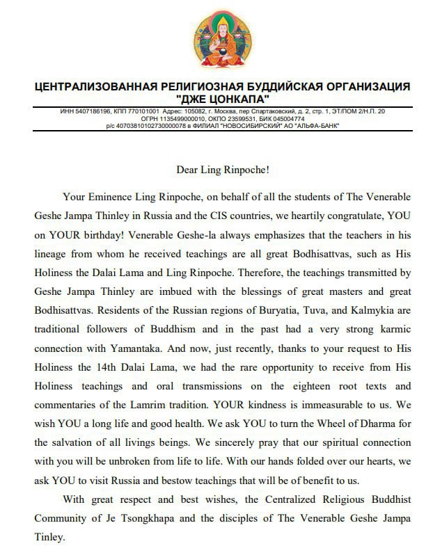 Жители российских регионов — Бурятии, Тувы, Калмыкии являются традиционными последователями буддизма, и в прошлом имели очень прочную кармическую связь с Ямантакой. И в настоящем времени, совсем недавно, благодаря Вашей просьбе Его Святейшеству Далай-ламе XIV, мы имели редкую возможность получить от Его Святешейства Учения и устные передачи по восемнадцати коренным текстам и комментариям традиции Ламрим. Для нас Ваша доброта неизмерима. Желаем Вам Долгой жизни и крепкого здоровья. Просим Вас, пожалуйста, вращайте Колесо Дхармы, ради спасения всех живых существ. Искренне молимся, о том, чтобы наша духовная связь с Вами была нерушима из жизни в жизнь. Сложив руки у сердца, просим Вас приехать с визитом в Россию и даровать Учение, которое будет нам полезно.